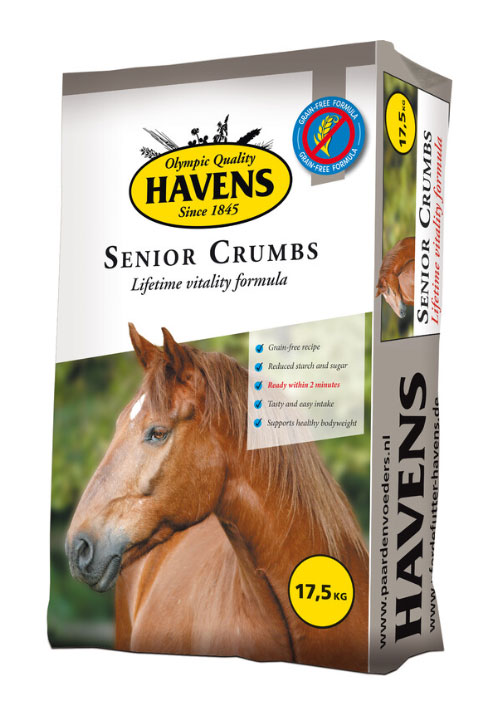 Read More Contact To BuySenior Crumbs is a small pelleted feed (crumble), designed to meet the nutritional needs of horses in their golden years, soak and its ready in 2 minutes. It is grain-free, rich in vitamins and helps to maintain good health while the aging horse faces difficulties in chewing and/or a loss of physical condition. 38.5lb/bag (17.5kg).
